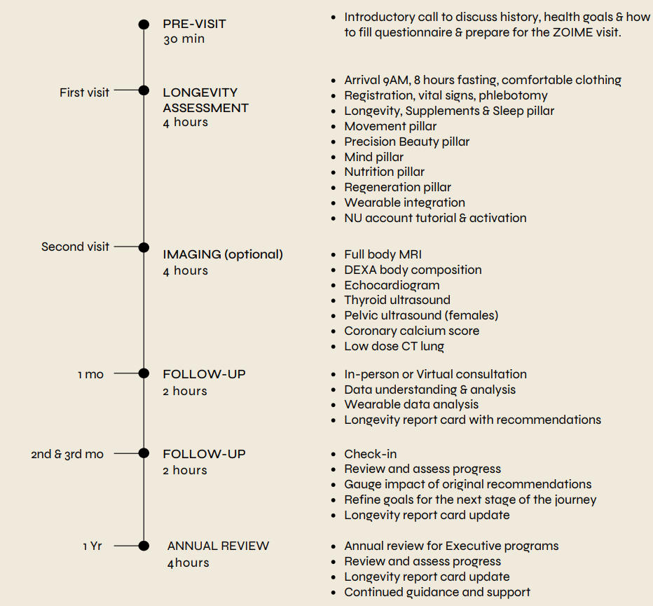 - Longevity, Movement, Nutrition, Sleep, Aesthetics, Brain & Regen health assessments